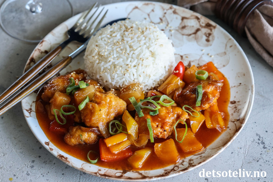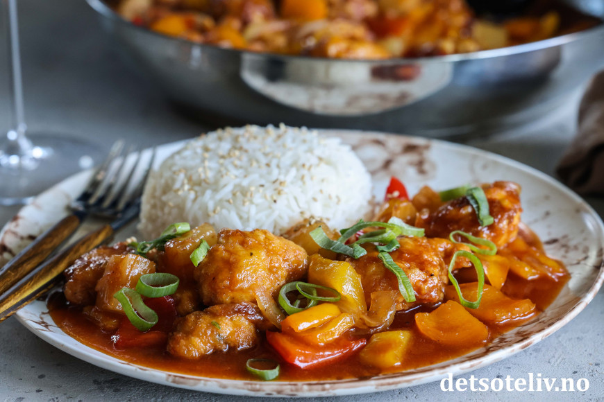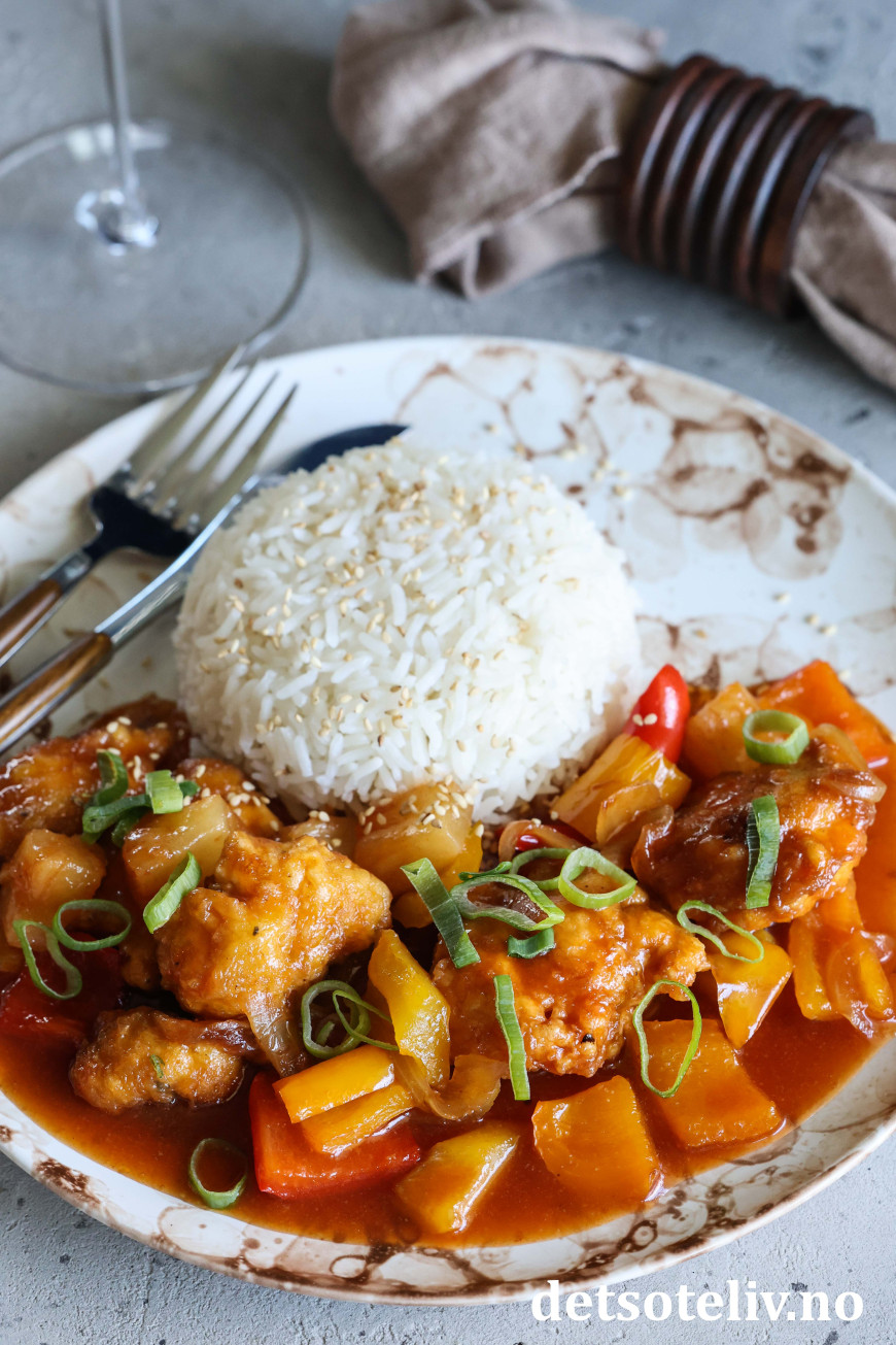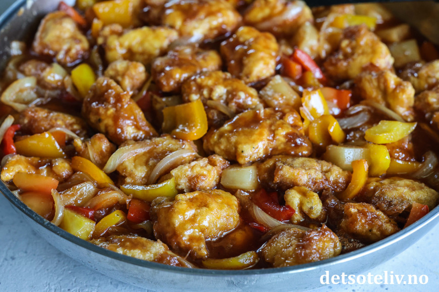Kylling i sursøt saus består av innbakte, friterte kyllingbiter som vendes i en fantastisk god sursøt saus med paprika, løk og ananas.