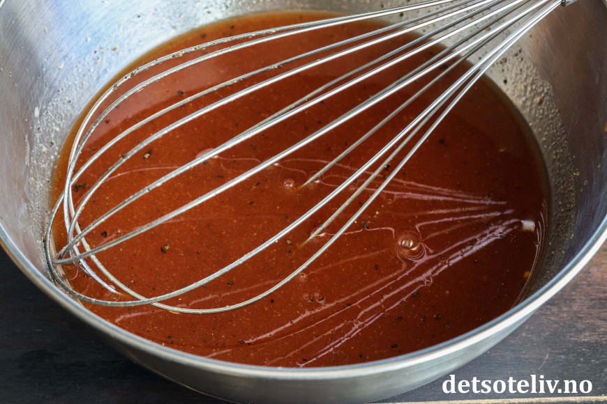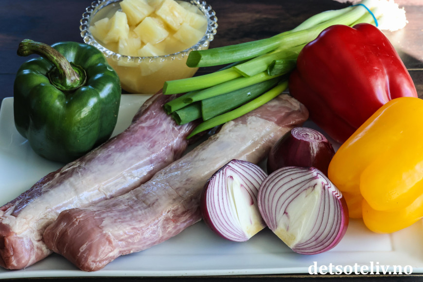 Finn frem ingrediensene til sausen. Visp sammen ananasjuice, hvitt og brunt sukker, eplecidereddik, ketchup, soyasaus, hvitløkspulver og sennepspulver. Rør ut maisenna i litt kaldt vann og visp maisennavannet deretter inn i sausen. Smak til sausen med kvernet salt og pepper.