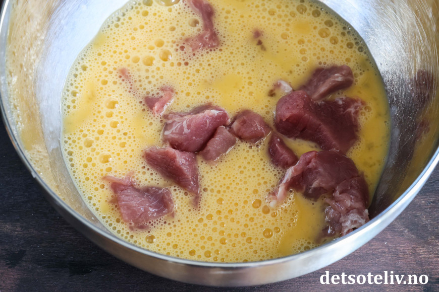 Vend svinefiletbitene først i bollen med eggeblandingen, deretter i bollen med maisenna, og så på nytt i eggeblandingen.