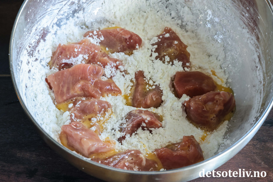 Gjenta med resten av svinefiletbitene, slik at de først vendes i eggeblanding, så i maisennablanding, og så på nytt i eggeblandingen, før de stekes i oljen.