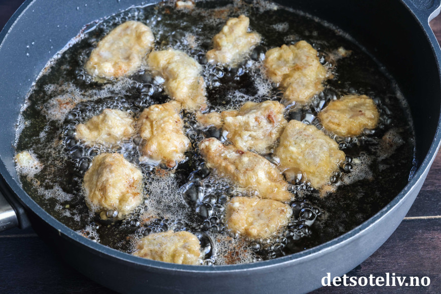 ♥ Til frityrstekingen har jeg her brukt avokadoolje. Det er en olje som tåler høy temperatur ved frityrsteking veldig bra, og som er nøytral på smak. En annen god olje å bruke til frityrsteking er peanøttolje. Både peanøttolje og avokadoolje er imidlertid nokså dyre produkter, og er på ingen måte nødvendig å bruke for å få et godt resultat. Det går kjempefint å bruke rapsolje, solsikkeolje eller annen nøytral matolje til frityrstekingen. Du kan eventuelt bruke noe avokadoolje og supplere med rapsolje.