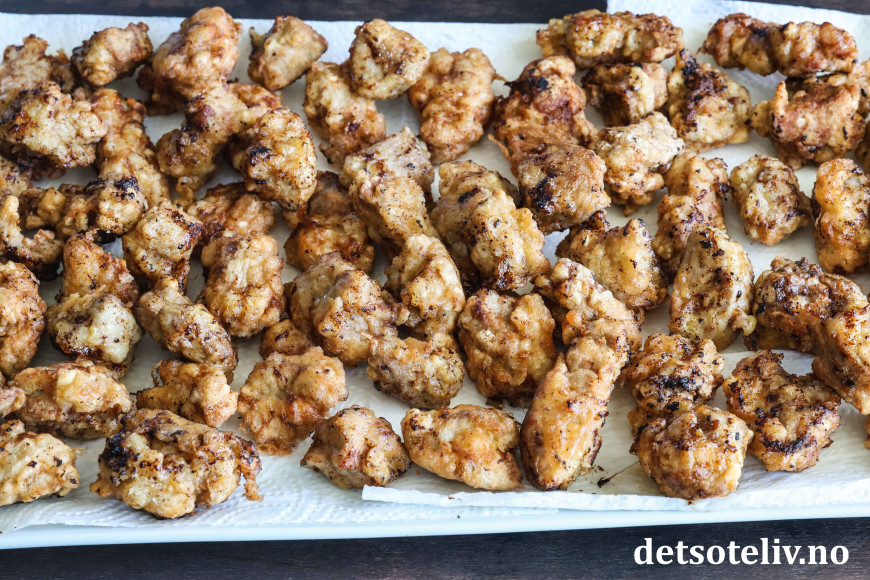 Samle opp alle de friterte kjøttbitene på kjøkkenpapir. Dekk til med folie mens du tilbereder sausen.