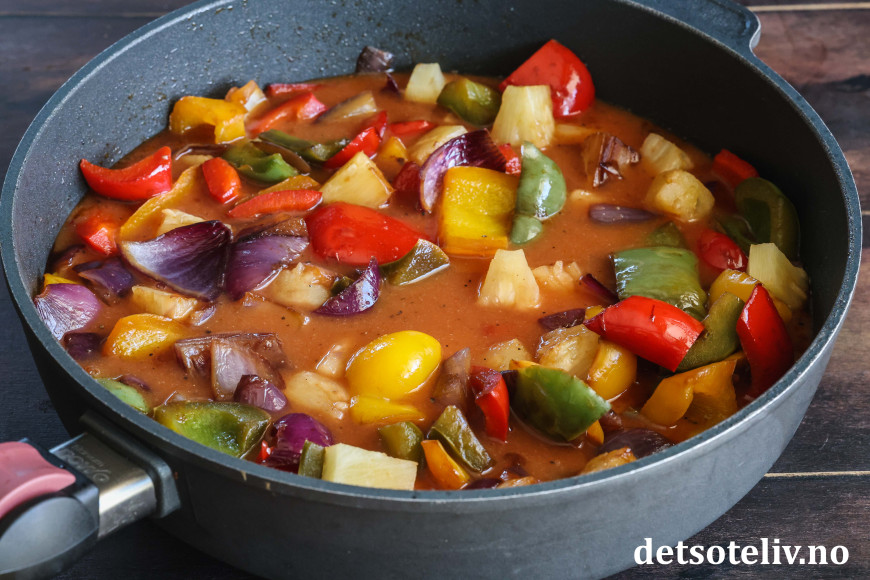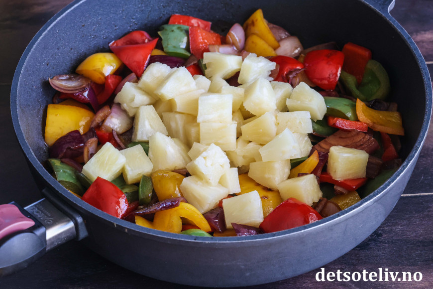 Hell sausen i pannen med grønnsakene og ananasen. Bland godt og vend deretter inn de friterte svinefiletbitene.