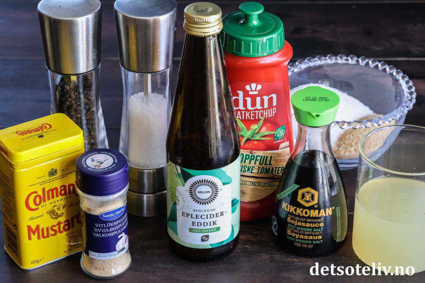 Visp sammen ananasjuice, hvitt og brunt sukker, eplecidereddik, ketchup, soyasaus, hvitløkspulver og sennepspulver. Rør ut maisenna i litt kaldt vann og visp maisennavannet deretter inn i sausen. Smak til sausen med kvernet salt og pepper.