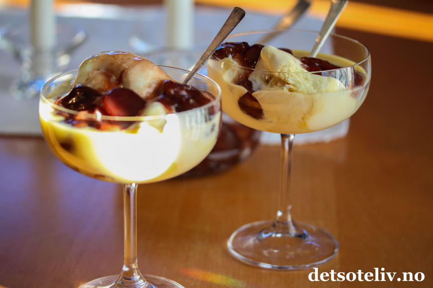 ♥ Du kan bruke hjemmelaget vaniljeis eller ferdigkjøpt. Jeg brukte denne gangen ferdigkjøpt iskrem: "Premium Crème Brûlee" fra Diplom-Is, som har nydelig, mild karamellsmak som harmonerte veldig fint med kirsebærkompotten og eggelikøren.