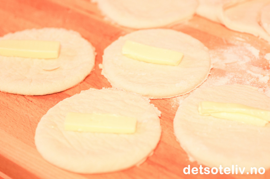 Stikk ut sirkler med utstikker eller et vannglass. Sirklene skal være ca 10 cm i diameter. Det blir ca 25-30 stk av denne oppskriften.