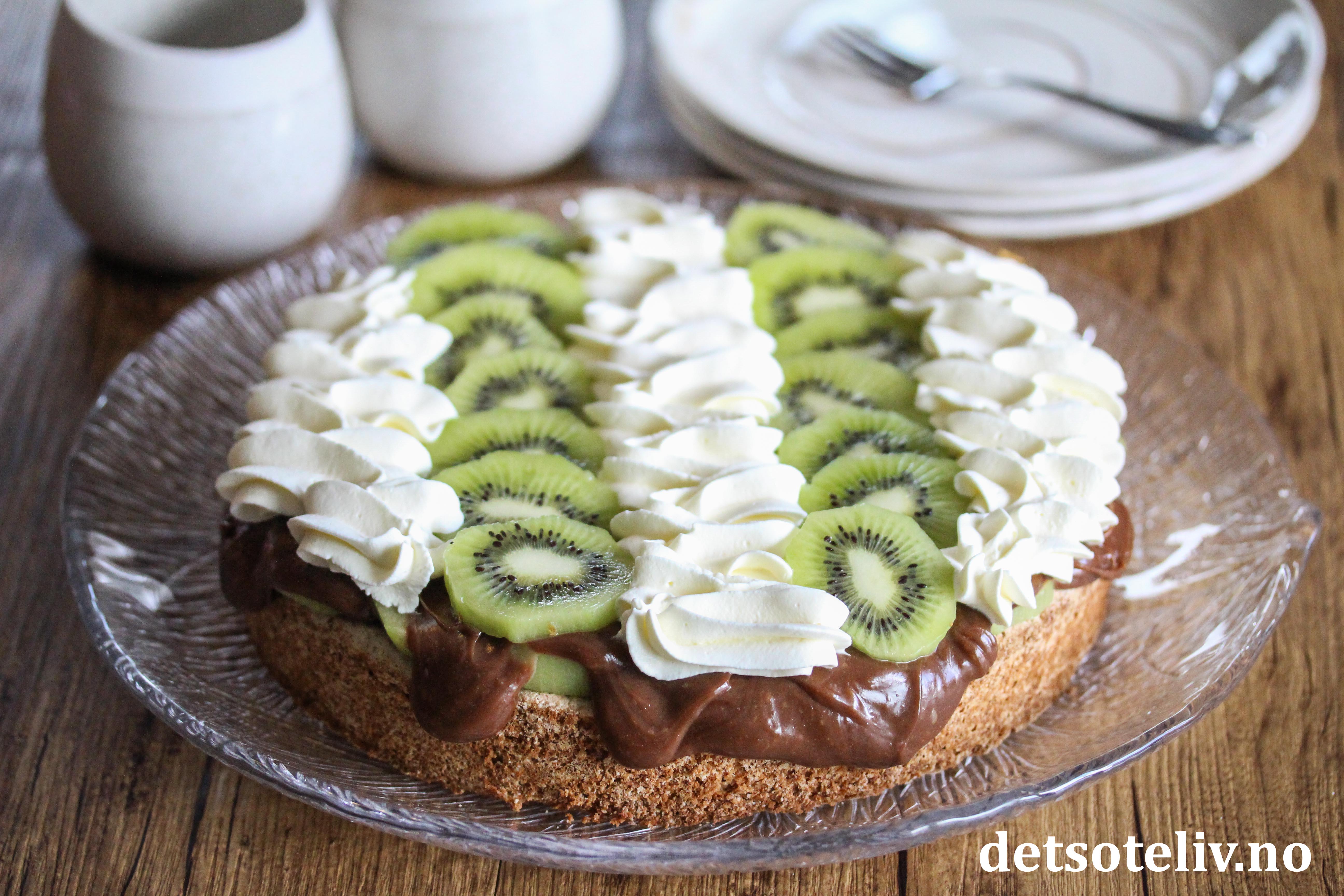Hvis du har lyst til å variere kaken, kan du legge bananskiver under sjokoladekremen i stedet for kiwiskiver. Det blir også veldig godt!