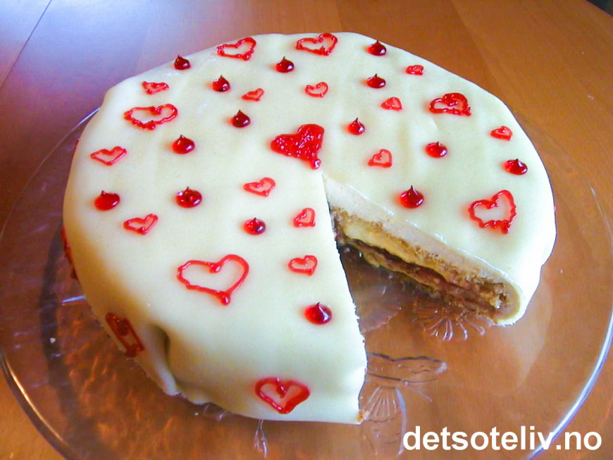Dekk hele kaken med pisket krem. Ha over marsipanlokk. Pynt kaken røde hjerter.