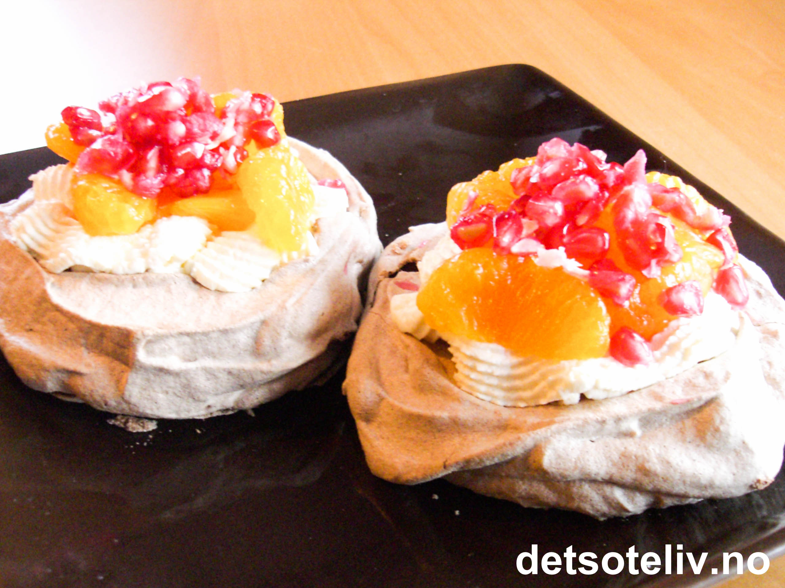 Pisk kremfløte og vaniljesukker til krem. Fordel kremen på toppen av kakene. Pynt med godt avrente mandarinbåter og granateplekjerner.