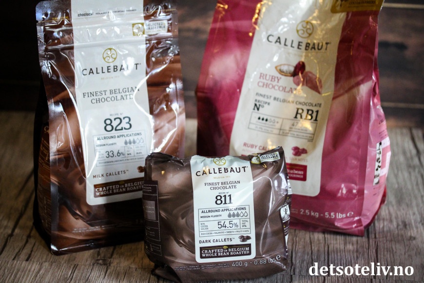♥ Callebaut er en veldig god, belgisk sjokolade. Jeg brukte følgende sjokolader fra Callebaut: mørk sjokolade HER, melkesjokolade HER og rubysjokolade HER.