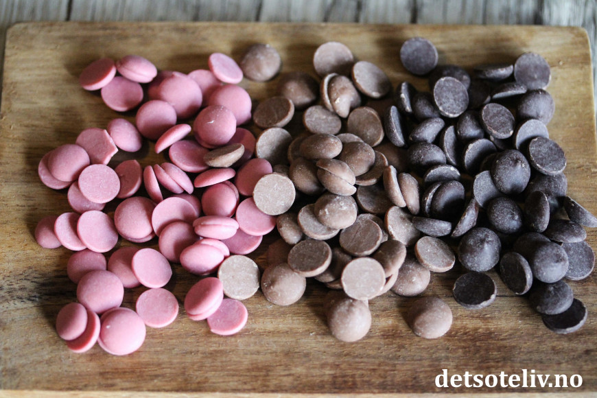 Vil du imponere litt ekstra, så bruk sjokolade i tre varianter som jeg har gjort her: mørk sjokolade, lys melkesjokolade og nydelig, rosa rubysjokolade.