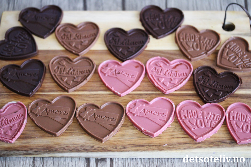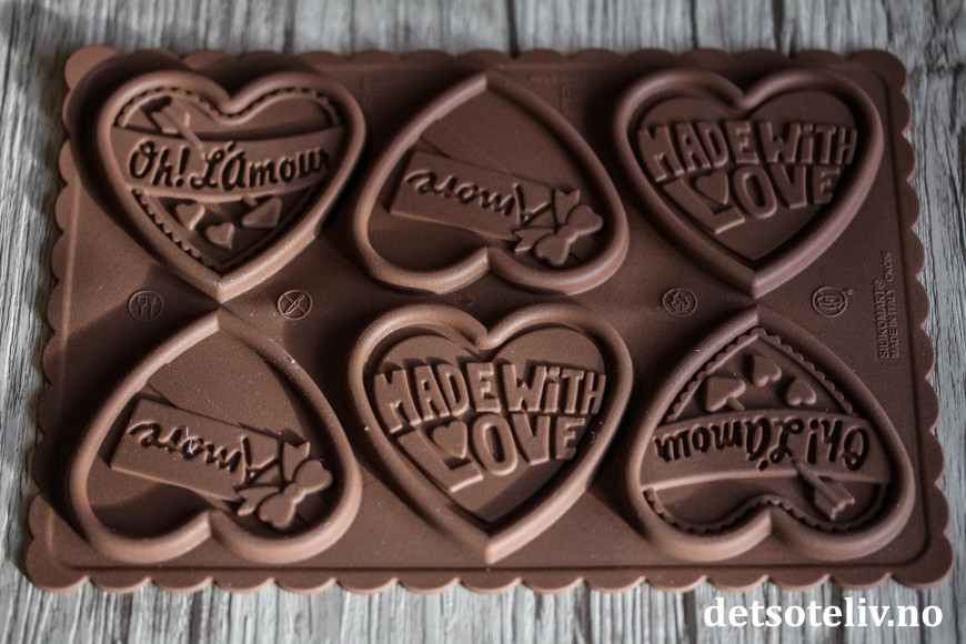 Samleside for sjokolade i nettbutikken finner du HER. Du kan også bruke Candy melts til å støpe hjertene. De finnes i flere smaker og farger, se samleside HER.