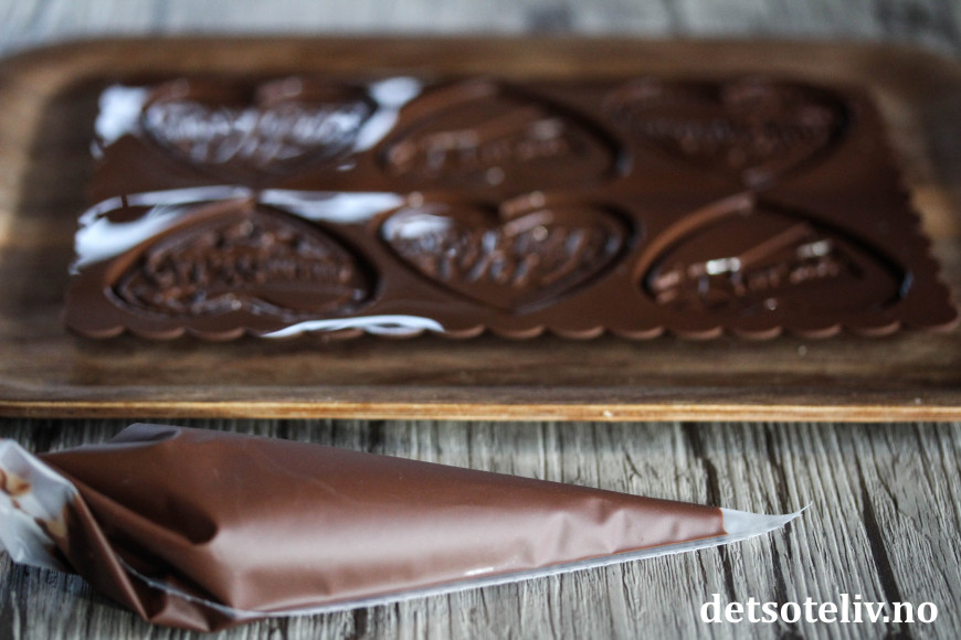 Ha den smeltede sjokoladen i en liten sprøytepose. Legg silikonformen på et brett.