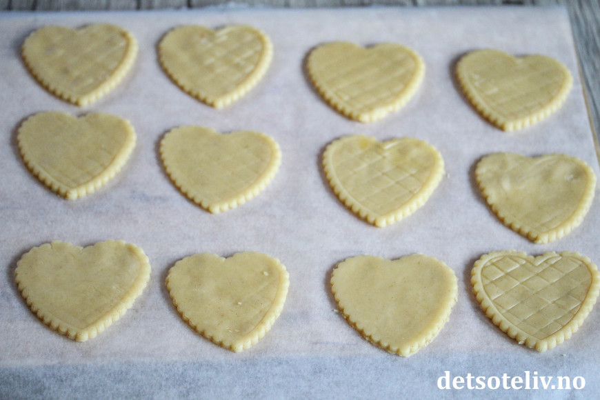 Kjevle ut deigen, ikke for mye av gangen, og ikke for tynt. Stikk ut hjerteformede kjeks med utstikkeren.