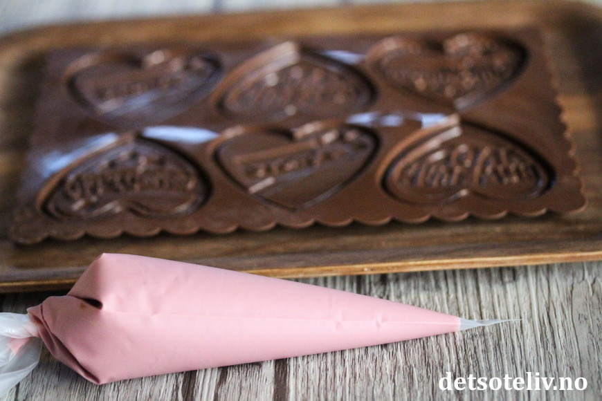 Ha den smeltede sjokoladen i en liten sprøytepose. Legg silikonformen på et brett. Fyll sjokoladen i silikonformen. Stryk forsiktig over sjokoladen med en palettkniv for å glatte til overflaten (dette for at sjokoladehjertet skal ligge flatt oppå vaniljekjeksen). Sett silikonformen i kjøleskapet i minst 30 minutter, eller til du ser at sjokoladen har stivnet helt.