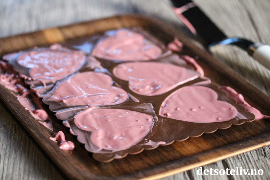 Da kan du forsiktig trykke sjokoladen ut av silikonformen. Legg de ferdigstøpte sjokoladehjertene på et brett som oppbevares i kjøleskapet til du skal bruke dem.
