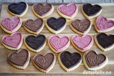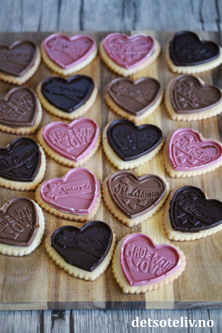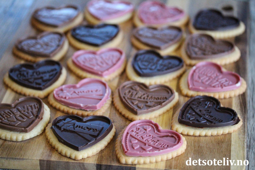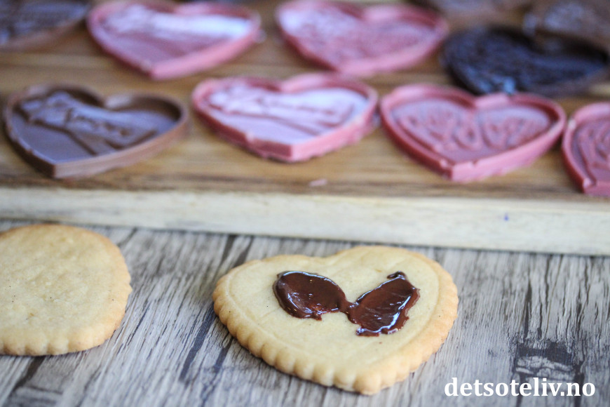 En super idé til Valentines er å lage søte, hjerteformede kjekssjokolader! Her har jeg først bakt kjempegode vaniljekjeks og så støpt sjokolade i hjerteformede silikonformer. Deretter "limes" sjokoladehjertene på vaniljekjeksene med litt smeltet sjokolade - vips så har du lekre kjekssjokolader!