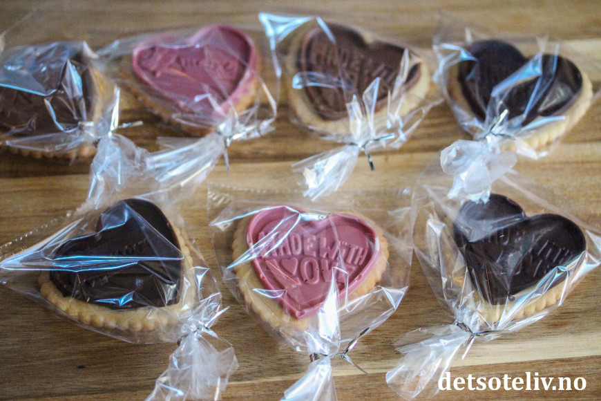 ♥ Du får nokså mange vaniljekjeks av denne porsjonen. Du må selvfølgelig ikke dekke alle med sjokoladehjerter, for vaniljekjeksene er kjempegode som de er også.