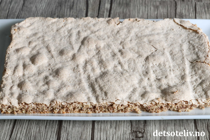 Avkjøl kaken i formen. Hvelv den ut og dra av bakepapiret. Del kaken på midten slik at du får to kakebunner med halv størrelse.