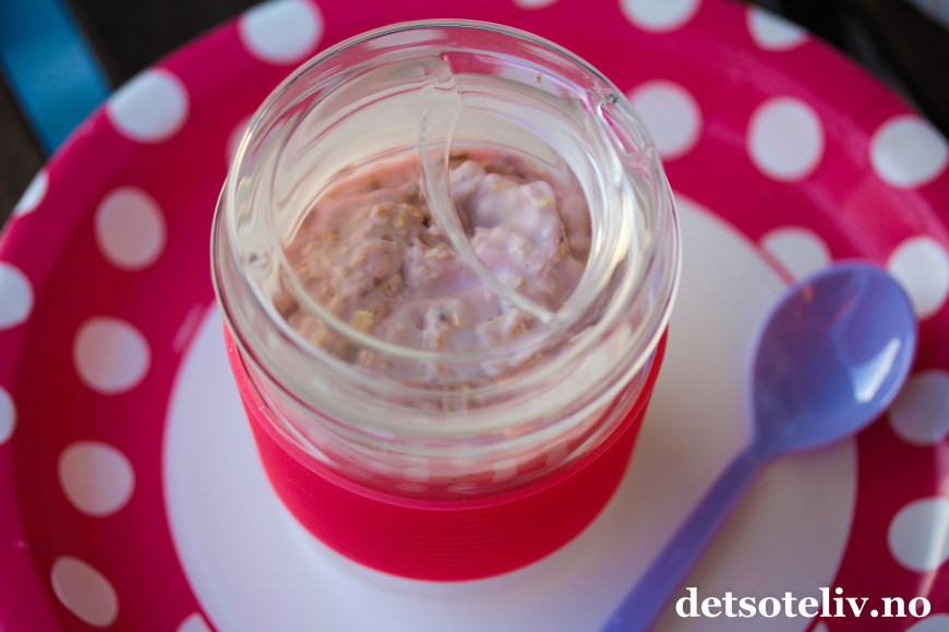 Jeg har her brukt et beger med bringebæryoghurt, men alle typer og smaksvarianter kan brukes. Sett på lokk hvis du har et som passer, eller dekk over med plasfolie. Sett i kjøleskapet over natten.