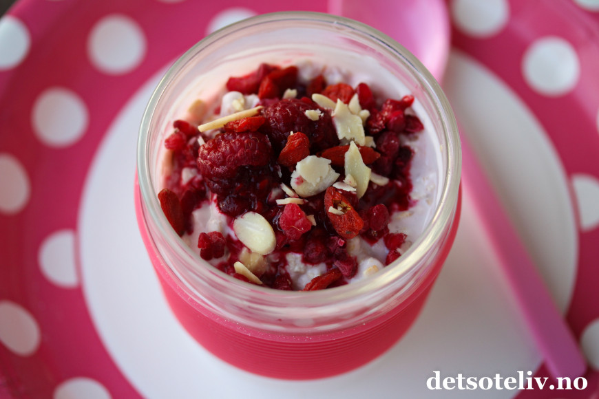 Det er selvsagt intet i veien for å bytte ut bringebæryoghurten med annen type yoghurt, og det samme gjelder såklart bærene på toppen.