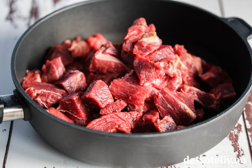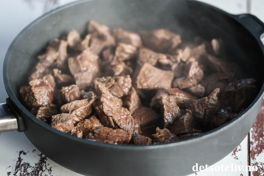 Start med å dele oksekjøttet i store terninger. Brun kjøttbitene i olje i en stekepanne på høy varme, slik at de får god stekeskorpe (stek i flere omganger så det ikke blir for fullt i stekepannen).
