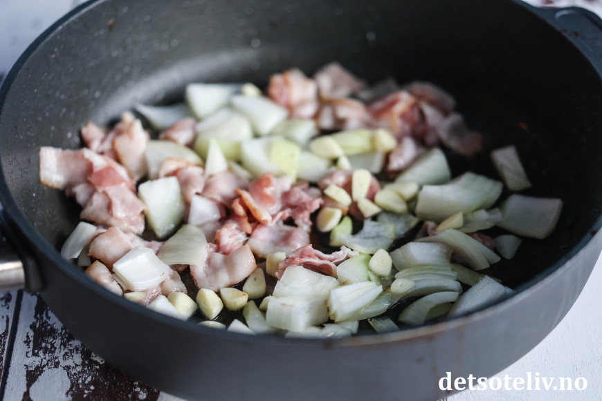 Skjær bacon opp i mindre biter. Grovhakk løk og hvitløksfedd. Ha bacon og løk i en stekepanne med litt mer olivenolje.
