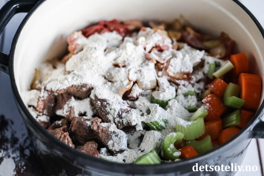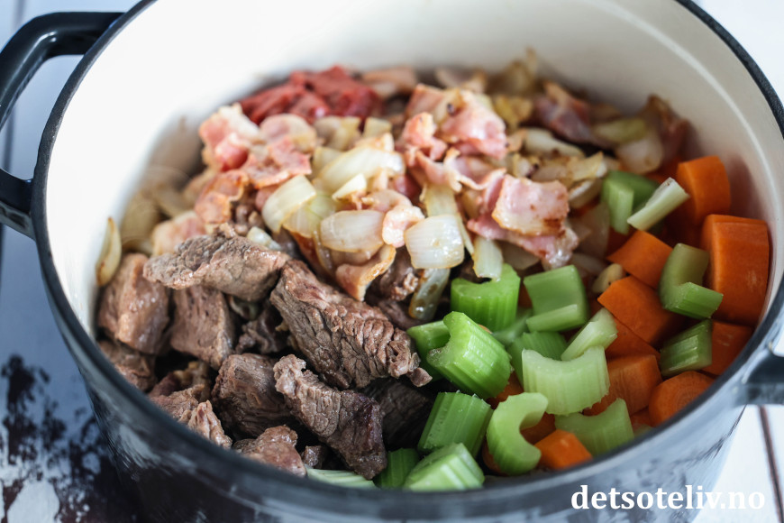 Ha dette deretter i gryten sammen med kjøttstykkene. Husk igjen å koke ut pannen med litt vann og ha stekesjyen i gryten.