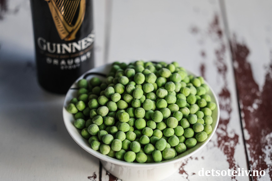 Sett på lokket og la gryten koke opp. Slå ned varmen på platen og la gryten småkoke / trekke under lokk i ca. 2 timer (se tips). Tilsett erter (de kan godt være frosne), kok opp på nytt og la gryten småkoke / trekke i 20 - 30 minutter til. Smak til med kvernet salt og pepper.