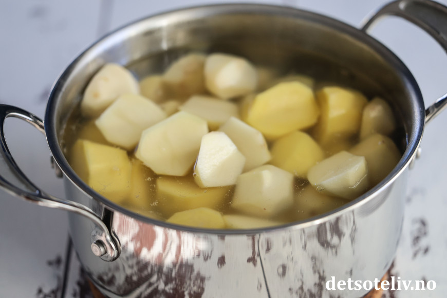 Mens kjøttgryten koker, lager du klar potetstappen: Skrell potetene og del dem opp i litt mindre biter. Ha dem i en kjele. Fyll opp kjelen med vann så vannet dekker potetbitene godt. NB! Ikke ha salt i vannet.