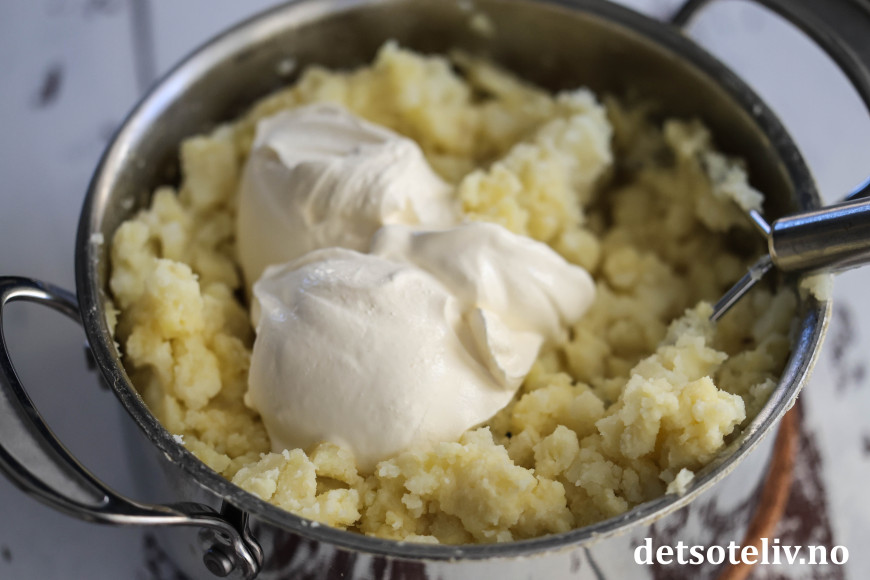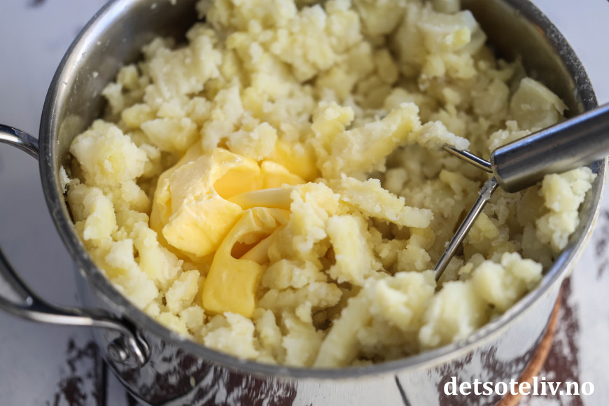 Mos de varme potetbitene med en potetstamper. NB! Ikke bruk stavmikser. Ha først smøret i kjelen, og bruk potetstamperen til å mose smøret jevnt inn i den varme stappen ettersom det smelter.