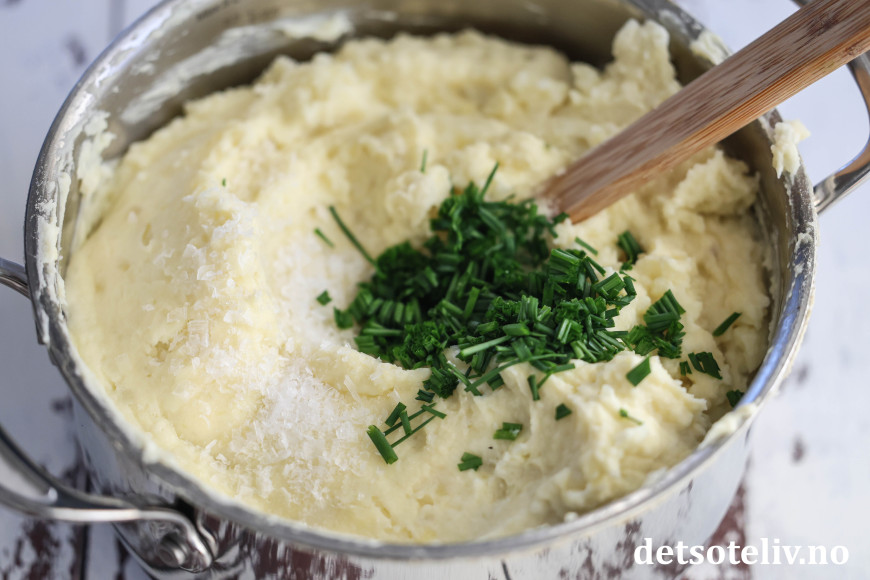 Mos de varme potetbitene med en potetstamper. NB! Ikke bruk stavmikser. Ha først smøret i kjelen, og bruk potetstamperen til å mose smøret jevnt inn i den varme stappen ettersom det smelter. Ha så i crème fraîche og bland godt. Rør inn melk (se tips). Tilsett finhakket gressløk og smak til med salt.