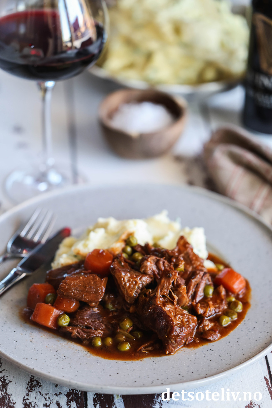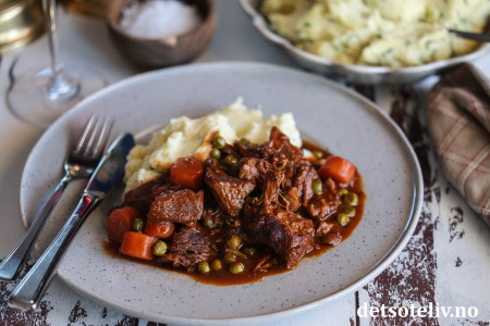 Server kjøttgryten varm med hjemmelaget potetmos ved siden av.