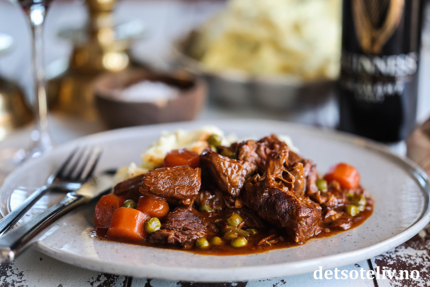 Her har du oppskrift på kjempegod Guinness Beef Stew. Gryten er irsk og ligner på tradisjonsrik Irish Stew, men en forskjell er at denne gryten lages med oksekjøtt og ikke lammekjøtt. Kjøttet skal småputre i flere timer som gjør at det blir veldig mørt. 😍