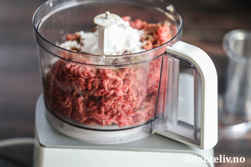 Ha kjøttdeigen i en food processor. Tilsett salt, potetmel og krydder.