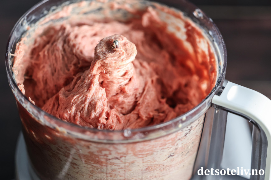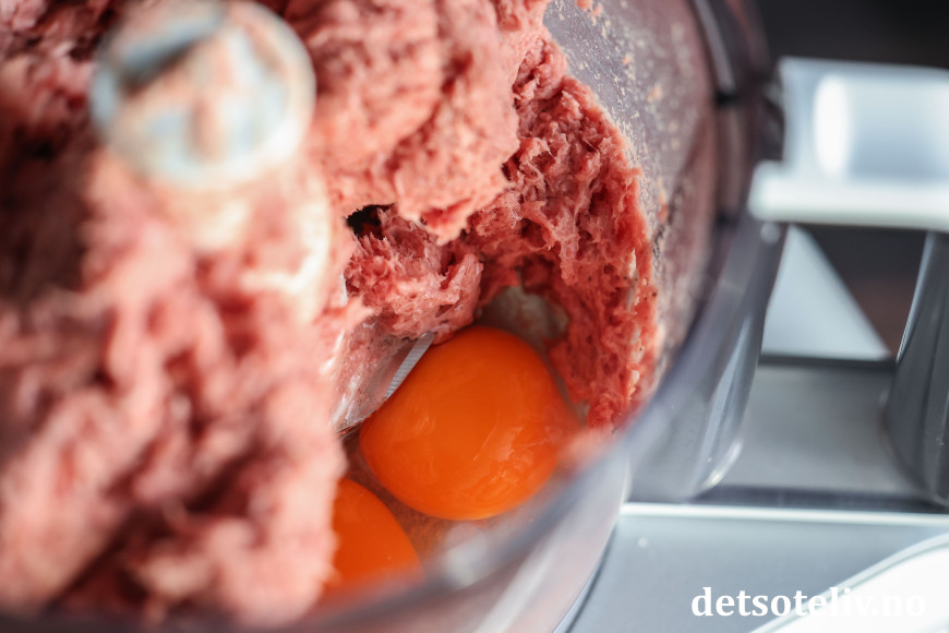 Kjør dette godt sammen til en glatt kjøttmasse. Tilsett eggene.