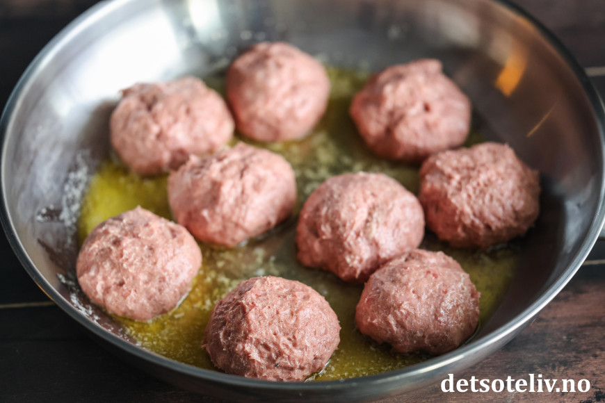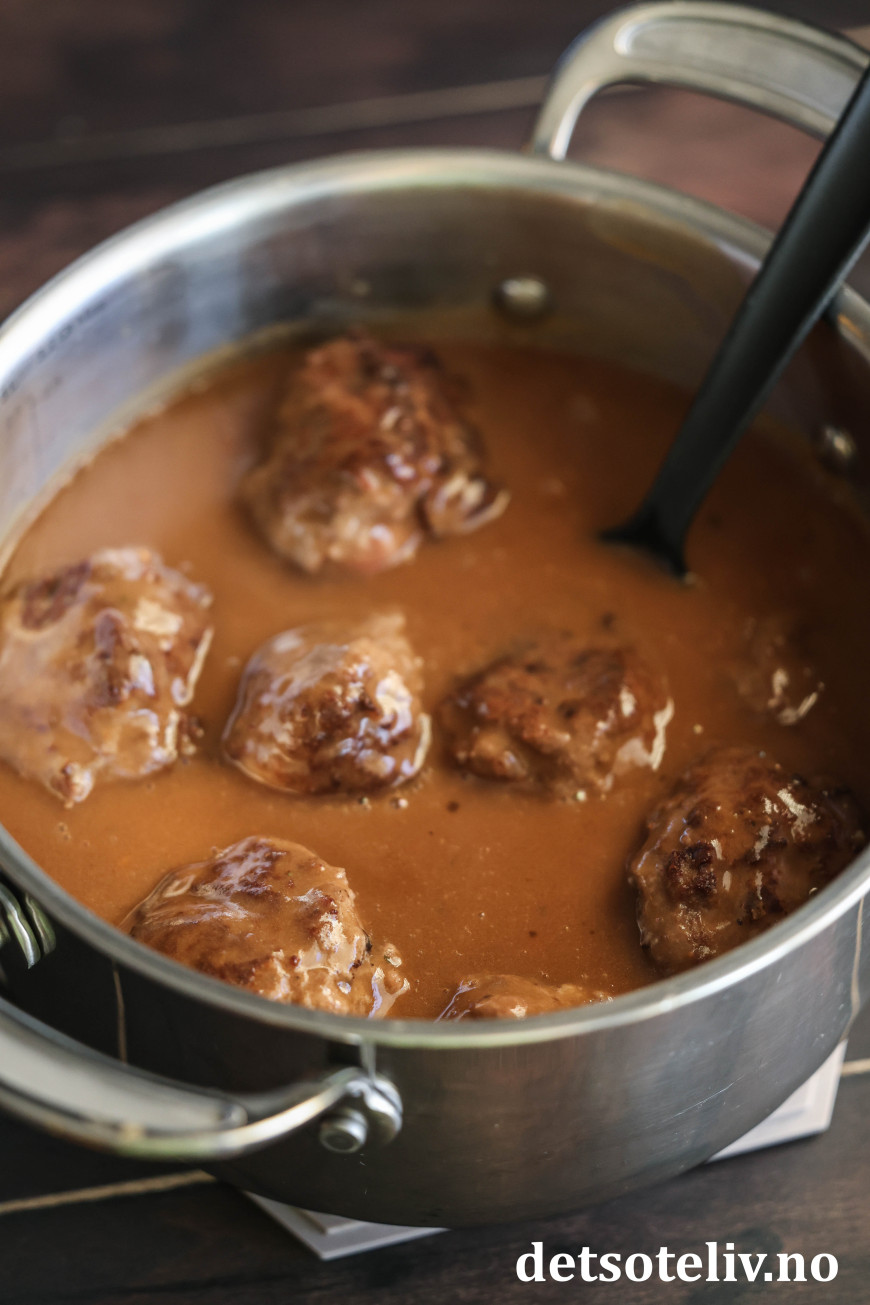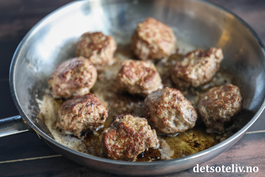 Kjøttkakene skal få god stekeskorpe, men trenger ikke å være helt gjennomstekt inni siden de skal trekke i varm saus etterpå.