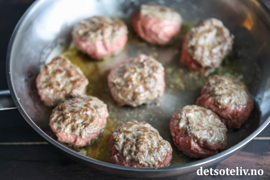 Smelt godt med smør i en stekepanne. Form kjøttkakene med en spiseskje og juster fasongen med hendene (dette er klissete, så skyll hendene ofte i kaldt vann).