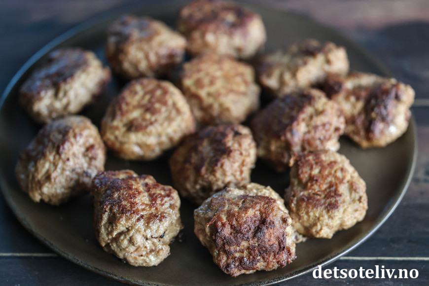 ♥ Det kan så være lurt å steke en liten test-kjøttkake i pannen først (så liten at den blir gjennomstekt i pannen), så kjenner du om kjøttet er passe krydret. Hvis du synes det trengs mer salt, pepper eller annet krydder, kan du blande det inn før du steker opp alle kjøttkakene.