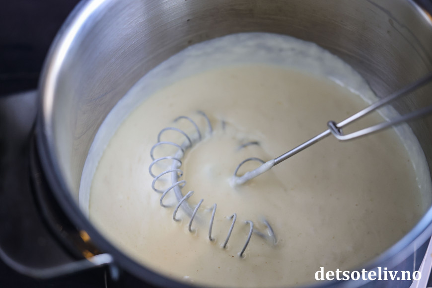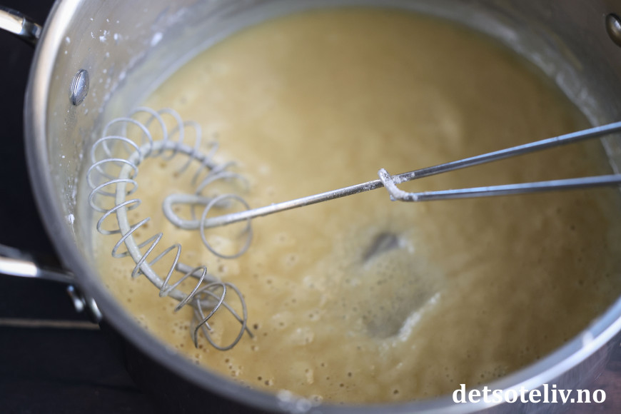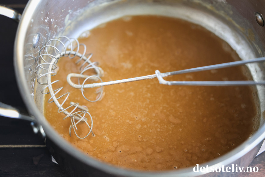 La jevningen brunes på middels varmen mens du visper hele tiden så den ikke svir seg i bunnen av kjelen.
