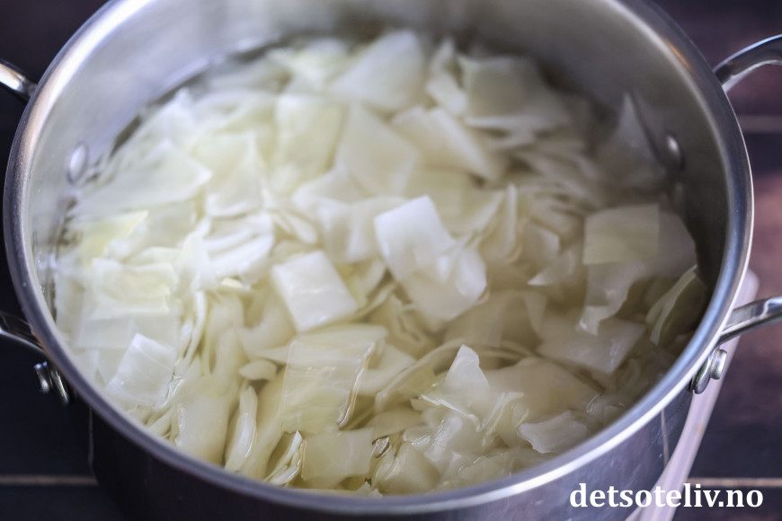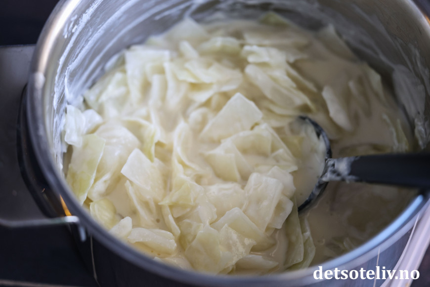 Hell deretter av vannet. La kålen stå og la væsken fordampe i noen minutter mens du lager den hvite sausen.