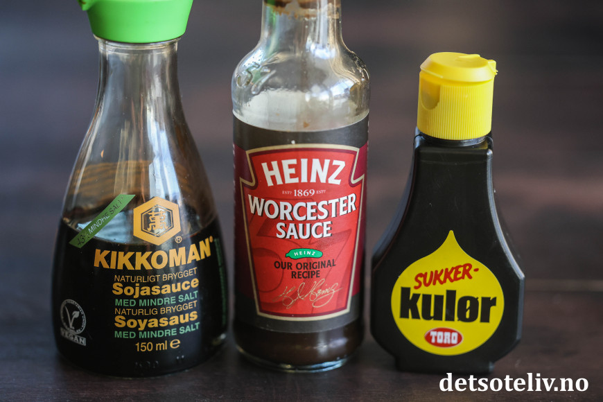 ♥ Det holder å krydre den brune sausen med salt og pepper, men den får en ekstra liten piff med litt soyasaus og worcestersaus. Sukkerkulør har ingen smak og tilsettes bare for fargens skyld (det trengs eventuelt kun noen dråper).