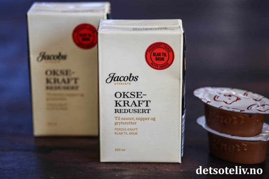 ♥ Som kjøttkraft kan du bruke ferdigkjøpt kraft eller fond som du rører ut med varmt vann. Jeg brukte her en kombinasjon (5 dl oksekraft og 2 stk fond du chef kjøtt, rørt ut i 5 dl varmt vann). Kok gjerne også ut stekepannen som du har stekt kjøttkakene i med litt vann og sil sjyen over i sausen. Kraft / fond gir best smak, men det går også helt greit å bruke et par terninger kjøttbuljong som du løser opp i varmt vann.