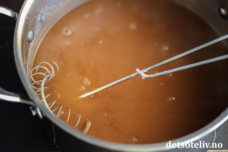 Når jevningen er brunet, sper du med kjøttkraft, litt om gangen mens du visper, slik at du får en klumpfri saus. La sausen småkoke i noen minutter så den tykner mens du rører.