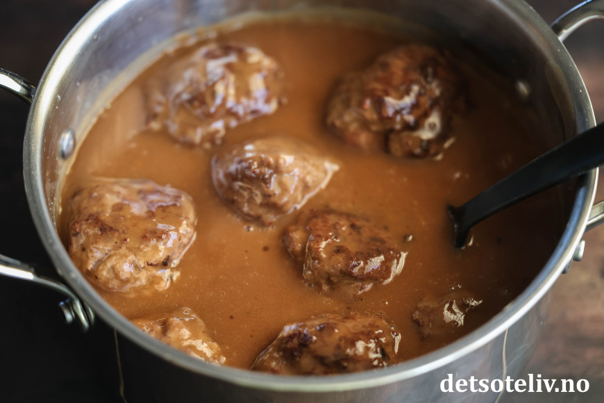 La de trekke /småputre i den varme sausen i ca. 20 minutter. Bruk middels varme så sausen ikke svir seg i bunnen, og rør forsiktig rundt i kjelen innimellom. Sjekk at kjøttkakene ikke lenger er noe rå inni før servering.