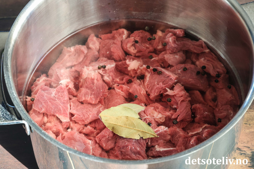 Skjær kjøttet i små terninger og legg kjøttbitene i en gryte sammen med sort pepper og laurbærblad. Hell på 2 liter vann.