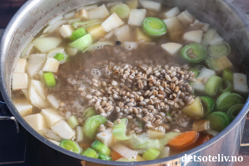 La suppen småkoke videre i 20–30 minutter, til grønnsakene og byggryn er møre.