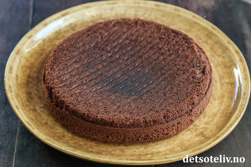 Ha deigen i en liten, rund form (20 cm i diameter) med bakepapir i bunnen. Stek kaken midt i ovnen ved 175°C i ca. 20 minutter (se tips). Avkjøl kaken i formen (helst over natten i kjøleskapet, se tips). Ta kaken ut av formen og dra av bakepapiret. Sett kaken på et kakefat.