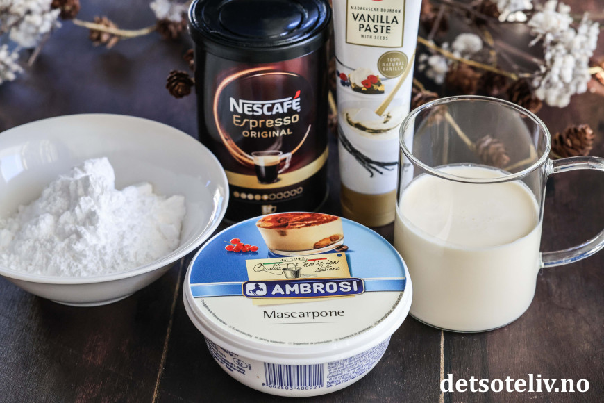 ♥ Jeg bruker instant espressopulver fra Nescafé. Dette pulveret løser seg veldig lett opp i den piskede mascarponekremen.