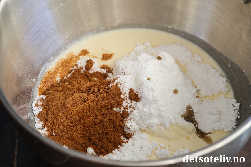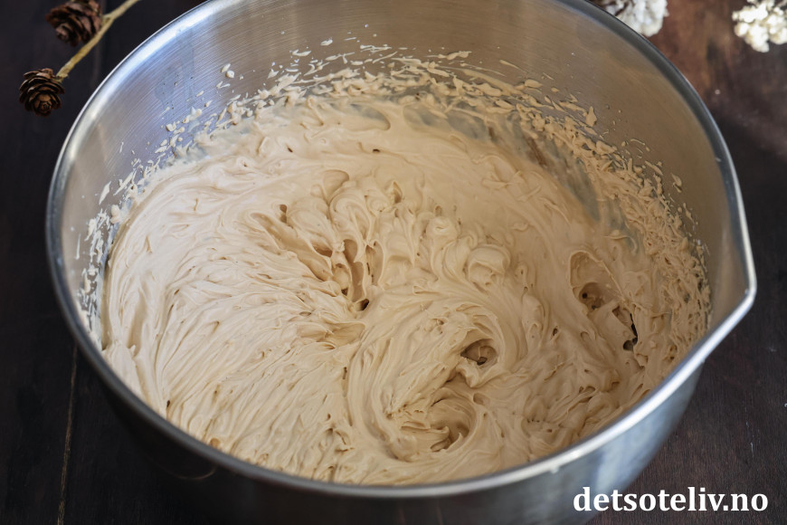 Pisk sammen alle ingrediensene til espressokremen. Jeg bruker elektrisk håndmikser til dette. Kremen skal bli tykk og fløyelsmyk.